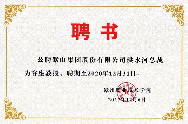 12月6日,紫山集團(tuán)總裁洪水河受聘為漳州職業(yè)技術(shù)學(xué)院客座教授,該校校長康溪順向總裁頒發(fā)了客座教授聘書。